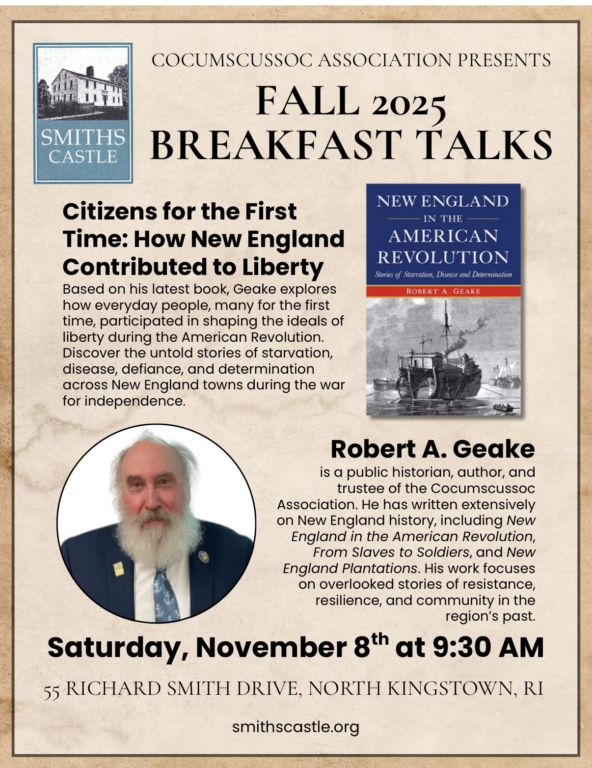 Public historian and Trustee offers a presentation entitled “Citizens for the First Time: How New England Communities Contributed to the Cause of Liberty.” This talk is based upon information from his new book New England in the American Revolution: Stories of Starvation, Disease, and Determination.