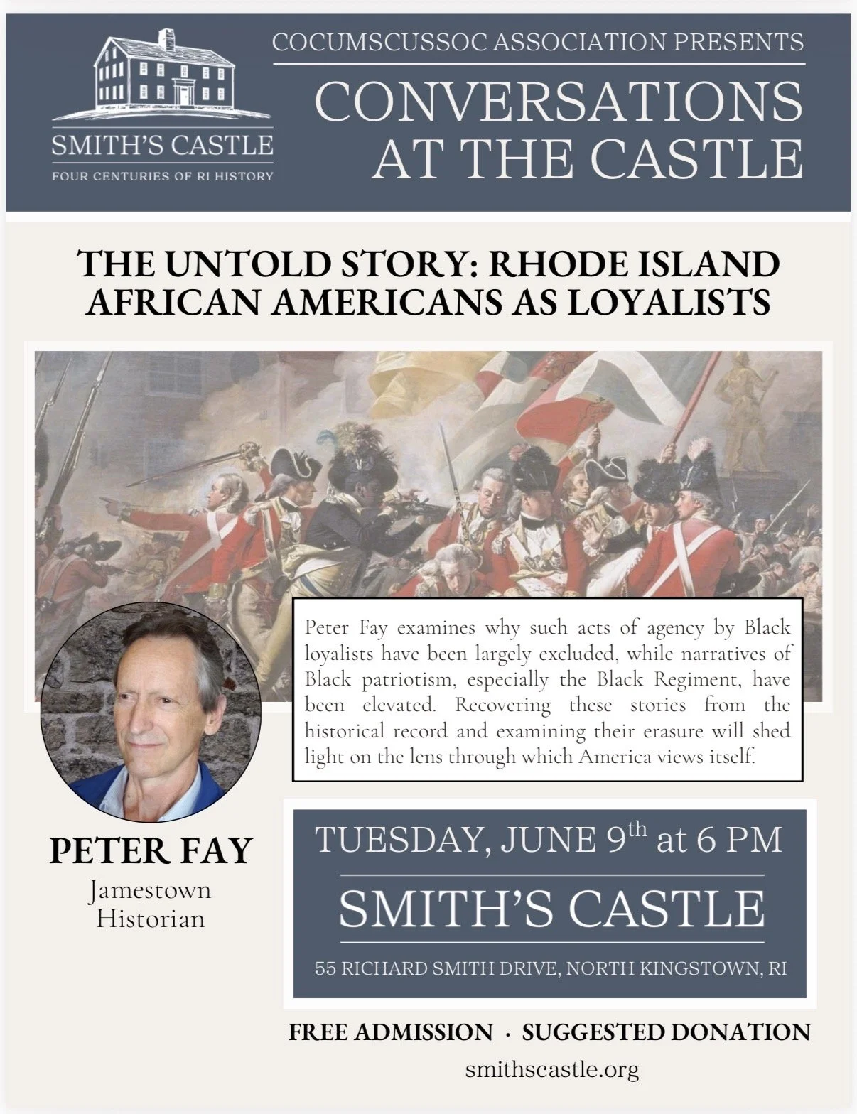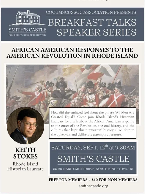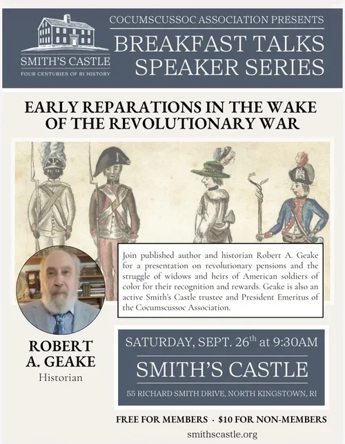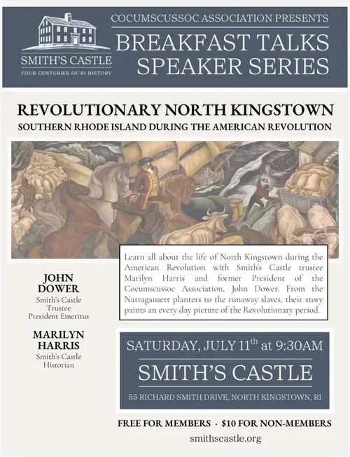 John Dower, Smith’s Castle Trustee and President Emeritus and Marilyn Harris Smith’s Castle Historian. Learn all about North Kingstown during the American Revolution. From the Narragansett planters to the runaway slaves, their story paints an every day picture of the Revolutionary period.
