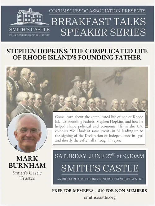 Come learn about the complicated life of one of RI's Founding Fathers, Stephen Hopkins, and how this self-taught person helped shape political and economic life in the U.S. colonies. We'll look at some events in Rhode Island leading up to the signing of the Declaration of Independence in 1776 and shortly thereafter, all through his eyes and experiences.