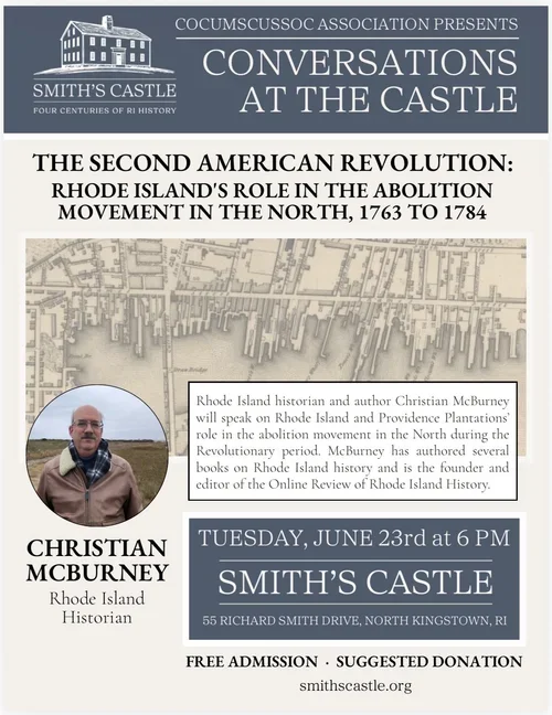 Historian Christian McBurney will give a presentation. The second American Revolution: Rhode Island’s role in the Abolition movement in the North, 1763 to 1784. RI historian Christian McBurney will speak on the RI and Providence Plantations’ role in the abolition movement in the North during the Revolutionary period. McBurney has authored several books on RI history and is the founder and editor of the Online Review of Rhode Island History.