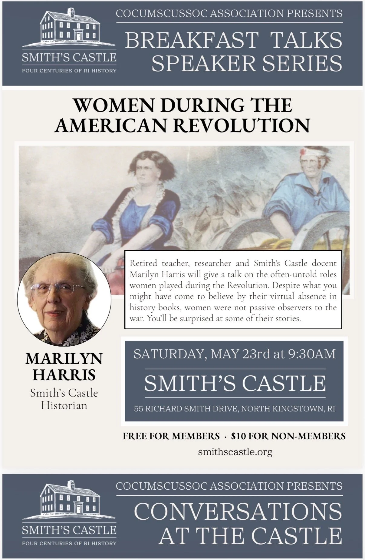 Smith’s Castle historian Marilyn Harris will talk about “Women During the American Revolution”