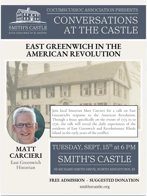 Matt Carcieri East Greenwich Historian gives a talk on East Greenwich’s response to the American Revolution. Through a focus specifically on the events of 1775 in to 1776, the talk will reveal the daily experiences of the residents of East Greenwich and the Revolutionary Rhode Island in the early years of the conflict.
